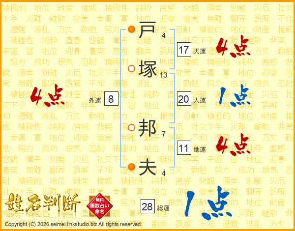 戸(4画)塚(13画) 邦(7画)夫(4画)