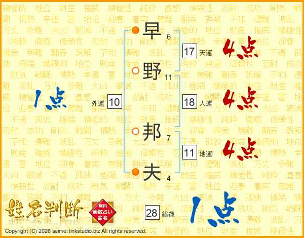 あなたの人生を表す1番重要な運勢です。生涯を通じて影響する総合運となり、主に50歳以降の晩年期に影響を及ぼします。苗字と名前の合計画数。