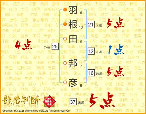 羽(6画)根(10画)田(5画) 邦(7画)彦(9画)