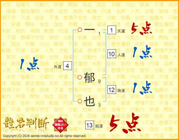 生活面を象徴する運勢です。外部から受ける影響力を表し、結婚運、家庭運や職場、環境への順応性を表します。総運から人運を引いた画数。姓や名が1文字の場合を除く。