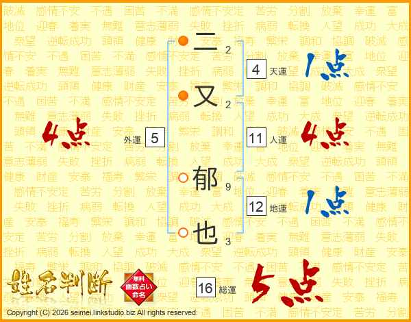 生活面を象徴する運勢です。外部から受ける影響力を表し、結婚運、家庭運や職場、環境への順応性を表します。総運から人運を引いた画数。姓や名が1文字の場合を除く。