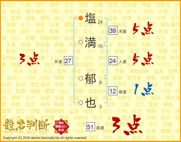 塩(24画)満(15画) 郁(9画)也(3画)