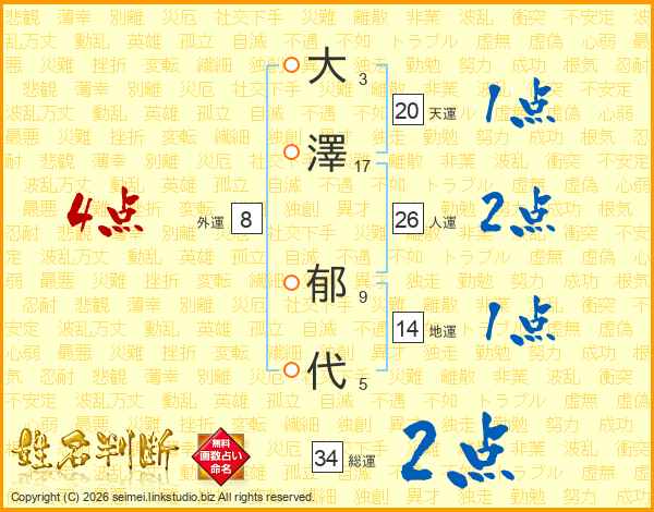 大(3画)澤(17画) 郁(9画)代(5画)