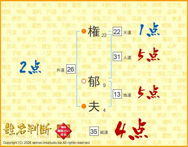 生活面を象徴する運勢です。外部から受ける影響力を表し、結婚運、家庭運や職場、環境への順応性を表します。総運から人運を引いた画数。姓や名が1文字の場合を除く。