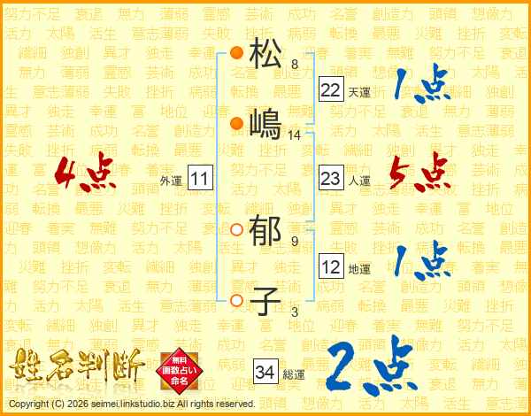 松(8画)嶋(14画) 郁(9画)子(3画)