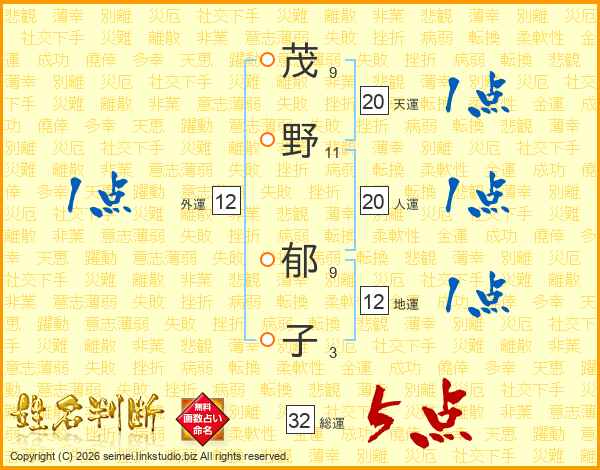 生活面を象徴する運勢です。外部から受ける影響力を表し、結婚運、家庭運や職場、環境への順応性を表します。総運から人運を引いた画数。姓や名が1文字の場合を除く。