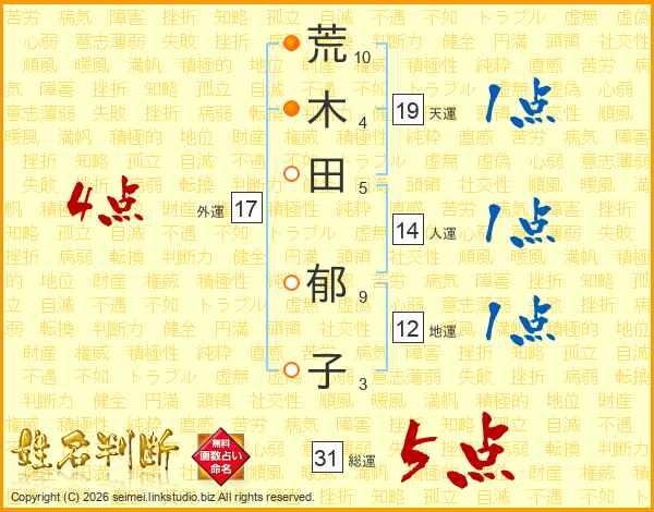 荒(10画)木(4画)田(5画) 郁(9画)子(3画)