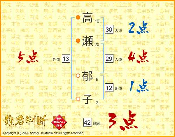 高(10画)瀬(20画) 郁(9画)子(3画)