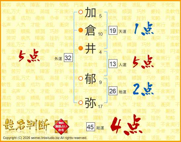加(5画)倉(10画)井(4画) 郁(9画)弥(17画)