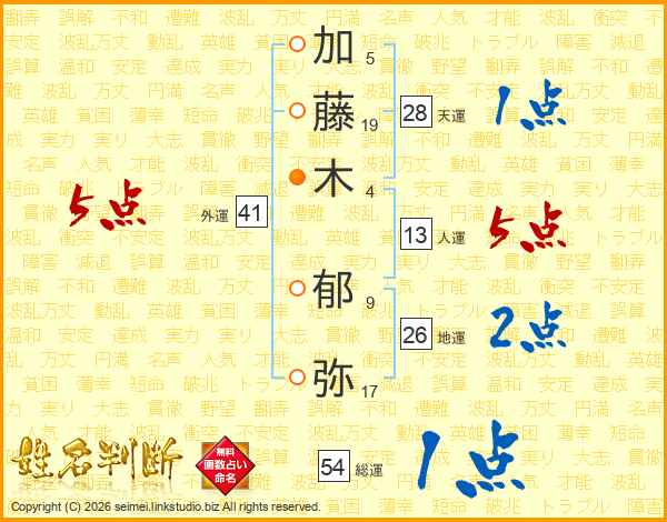 加(5画)藤(19画)木(4画) 郁(9画)弥(17画)