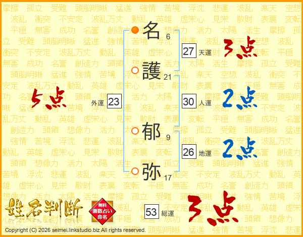 名(6画)護(21画) 郁(9画)弥(17画)
