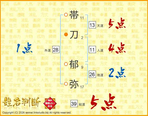 帯(11画)刀(2画) 郁(9画)弥(17画)