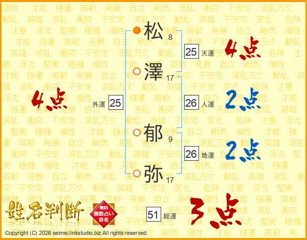 松(8画)澤(17画) 郁(9画)弥(17画)