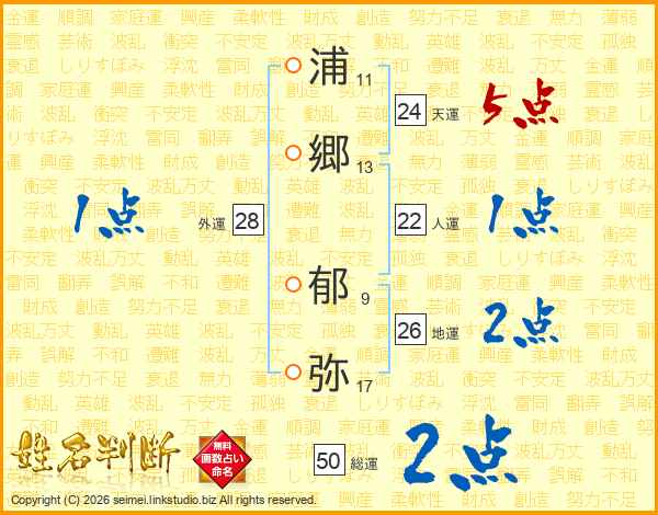 浦郷郁弥さんの地運は26画の2点!