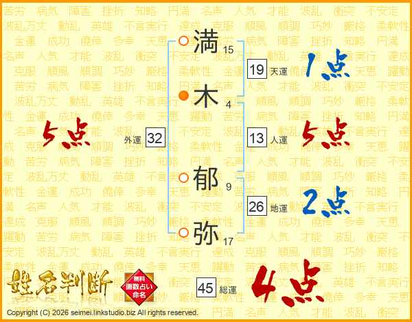 あなたの人生を表す1番重要な運勢です。生涯を通じて影響する総合運となり、主に50歳以降の晩年期に影響を及ぼします。苗字と名前の合計画数。