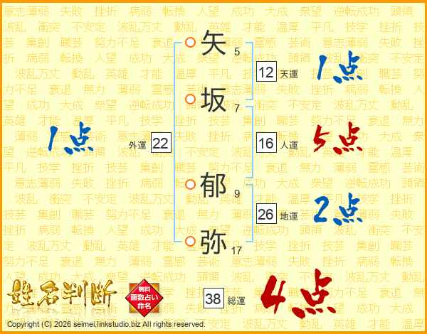 矢坂郁弥さんの総運は38画の4点!