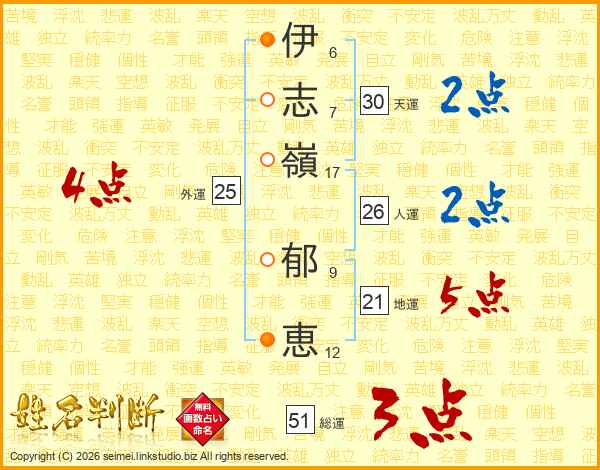 伊(6画)志(7画)嶺(17画) 郁(9画)恵(12画)