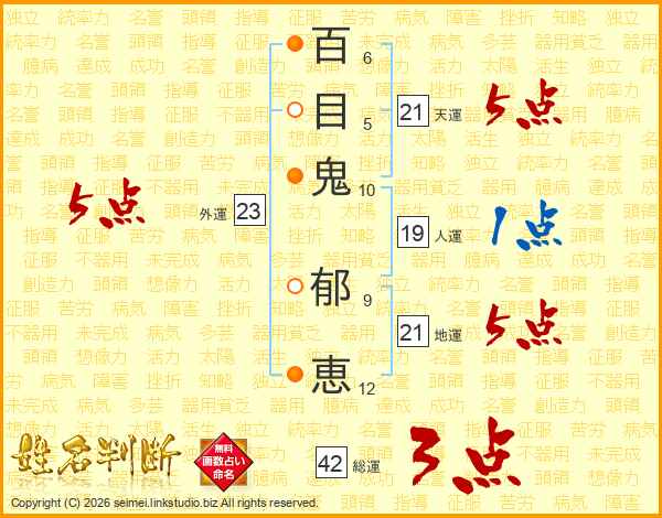 百(6画)目(5画)鬼(10画) 郁(9画)恵(12画)