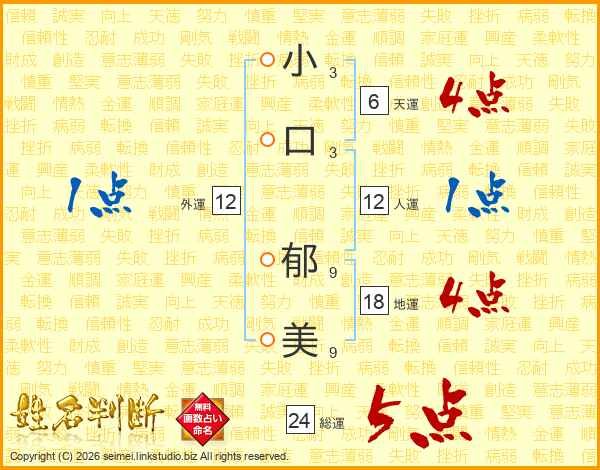 生活面を象徴する運勢です。外部から受ける影響力を表し、結婚運、家庭運や職場、環境への順応性を表します。総運から人運を引いた画数。姓や名が1文字の場合を除く。