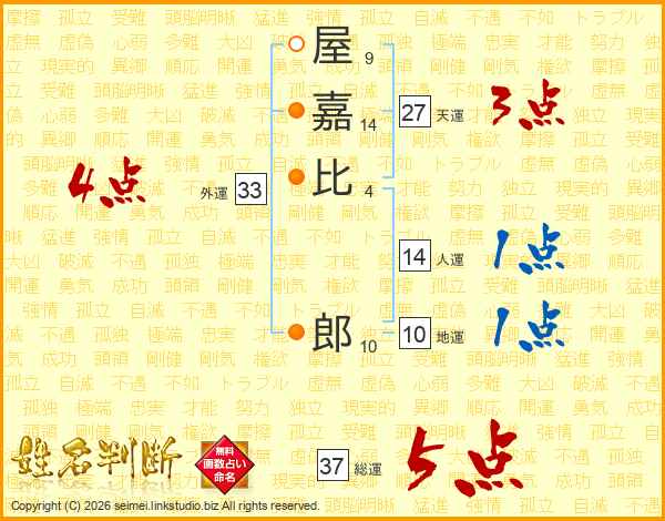 屋嘉比郎さんの総運は37画の5点!
