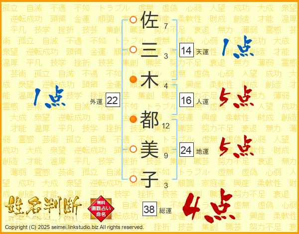 佐(7画)三(3画)木(4画) 都(12画)美(9画)子(3画)
