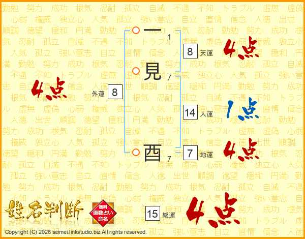 生活面を象徴する運勢です。外部から受ける影響力を表し、結婚運、家庭運や職場、環境への順応性を表します。総運から人運を引いた画数。姓や名が1文字の場合を除く。