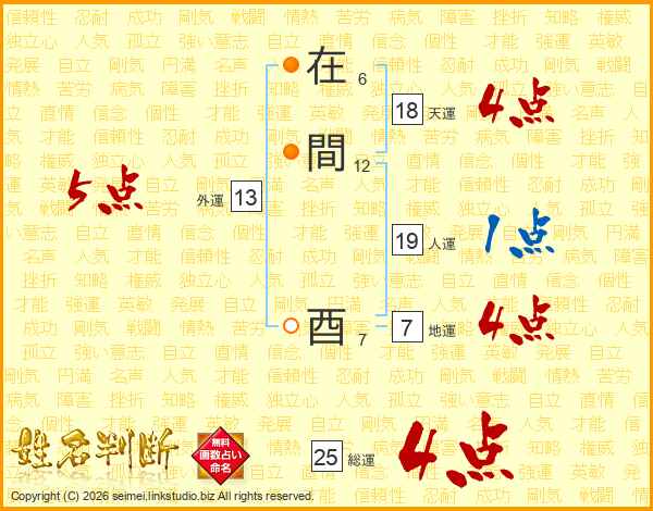家系が持つ宿命的な運勢を表します。祖先から受け継いだ苗字ですので自分の力が及びません。家柄を象徴します。苗字の合計画数。