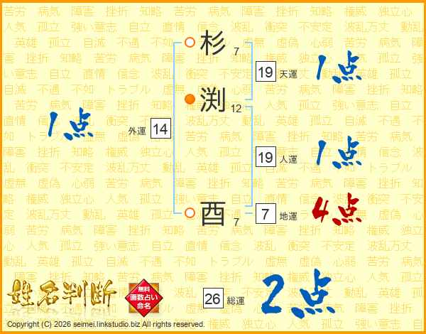 生活面を象徴する運勢です。外部から受ける影響力を表し、結婚運、家庭運や職場、環境への順応性を表します。総運から人運を引いた画数。姓や名が1文字の場合を除く。
