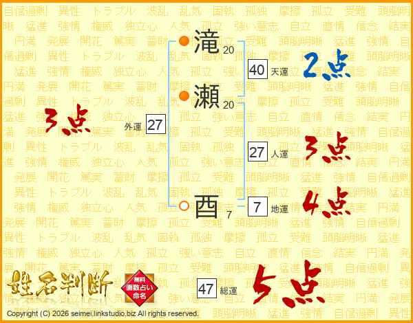 家系が持つ宿命的な運勢を表します。祖先から受け継いだ苗字ですので自分の力が及びません。家柄を象徴します。苗字の合計画数。