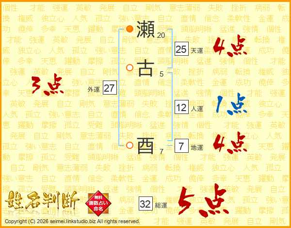 家系が持つ宿命的な運勢を表します。祖先から受け継いだ苗字ですので自分の力が及びません。家柄を象徴します。苗字の合計画数。