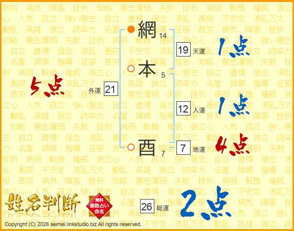 あなたの人生を表す1番重要な運勢です。生涯を通じて影響する総合運となり、主に50歳以降の晩年期に影響を及ぼします。苗字と名前の合計画数。