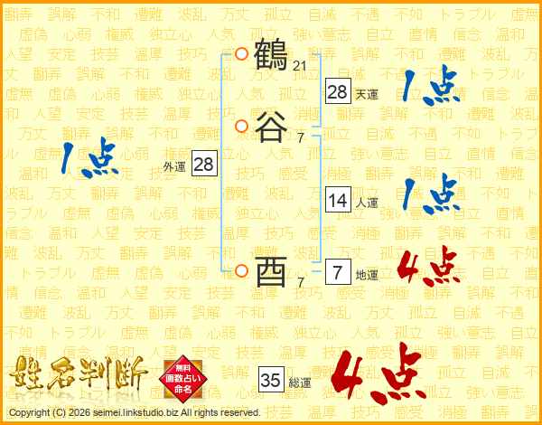 生活面を象徴する運勢です。外部から受ける影響力を表し、結婚運、家庭運や職場、環境への順応性を表します。総運から人運を引いた画数。姓や名が1文字の場合を除く。