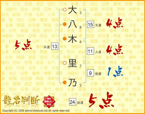 大(3画)八(8画)木(4画) 里(7画)乃(2画)