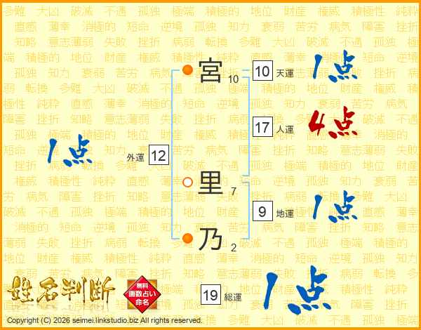 生活面を象徴する運勢です。外部から受ける影響力を表し、結婚運、家庭運や職場、環境への順応性を表します。総運から人運を引いた画数。姓や名が1文字の場合を除く。
