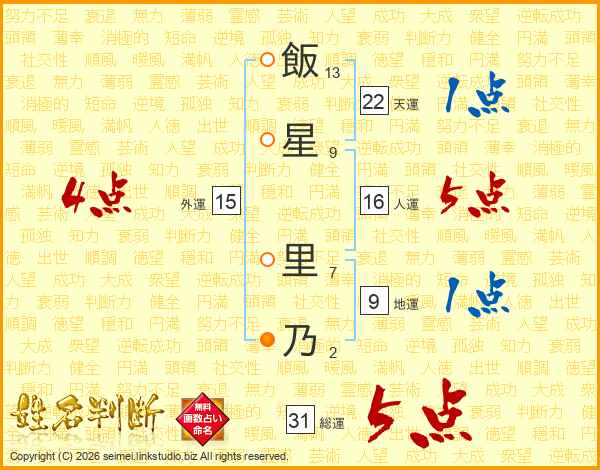 飯星里乃さんの総運は31画の5点!