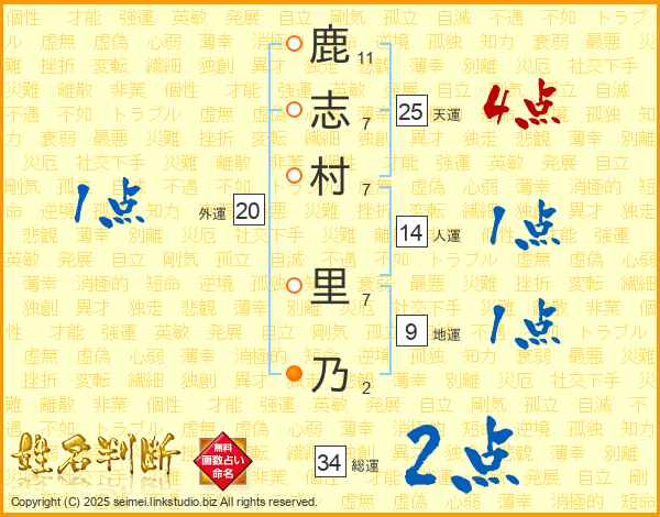 鹿(11画)志(7画)村(7画) 里(7画)乃(2画)