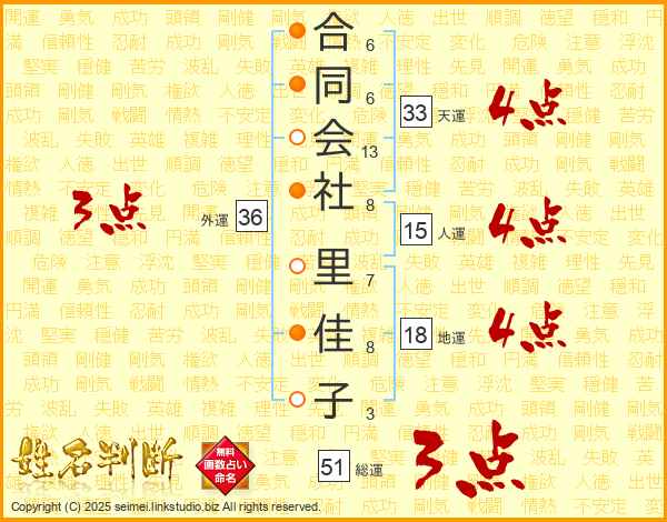 合(6画)同(6画)会(13画)社(8画) 里(7画)佳(8画)子(3画)