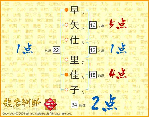 早(6画)矢(5画)仕(5画) 里(7画)佳(8画)子(3画)