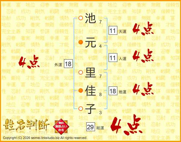 池(7画)元(4画) 里(7画)佳(8画)子(3画)