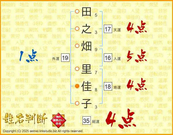 田(5画)之(3画)畑(9画) 里(7画)佳(8画)子(3画)