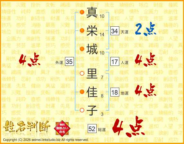 真(10画)栄(14画)城(10画) 里(7画)佳(8画)子(3画)
