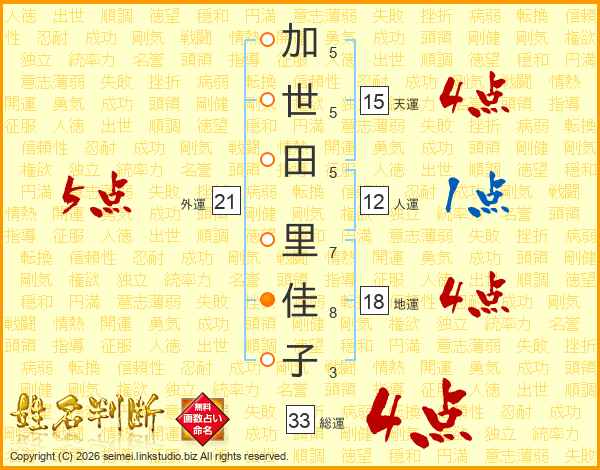 加(5画)世(5画)田(5画) 里(7画)佳(8画)子(3画)
