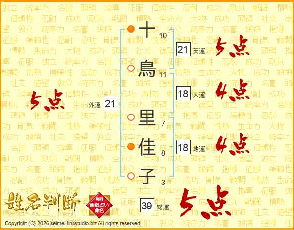 十鳥里佳子さんの総運は39画の5点!