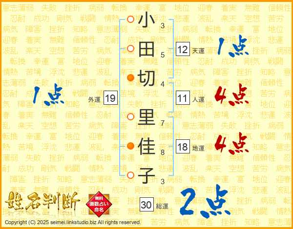 小(3画)田(5画)切(4画) 里(7画)佳(8画)子(3画)