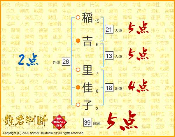 稲(15画)吉(6画) 里(7画)佳(8画)子(3画)