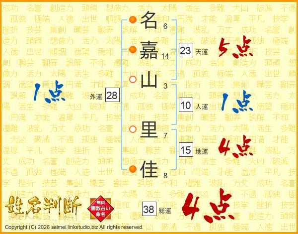 名(6画)嘉(14画)山(3画) 里(7画)佳(8画)