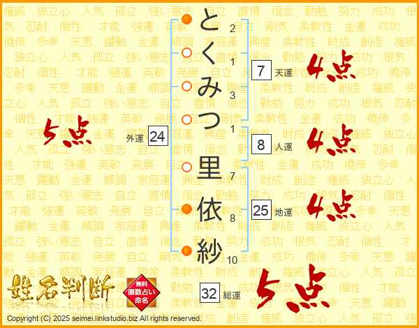 と(2画)く(1画)み(3画)つ(1画) 里(7画)依(8画)紗(10画)