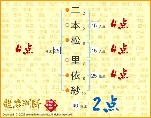 二(2画)本(5画)松(8画) 里(7画)依(8画)紗(10画)