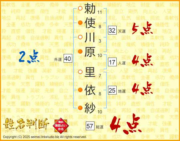 勅(11画)使(8画)川(3画)原(10画) 里(7画)依(8画)紗(10画)