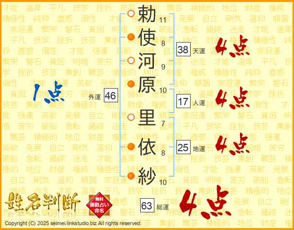 勅(11画)使(8画)河(9画)原(10画) 里(7画)依(8画)紗(10画)